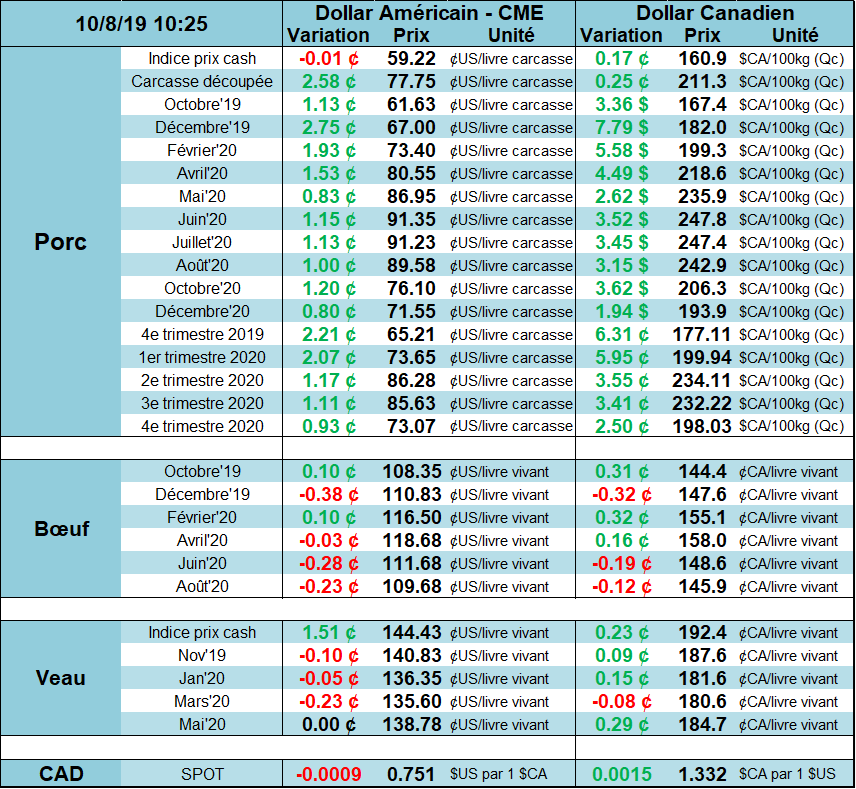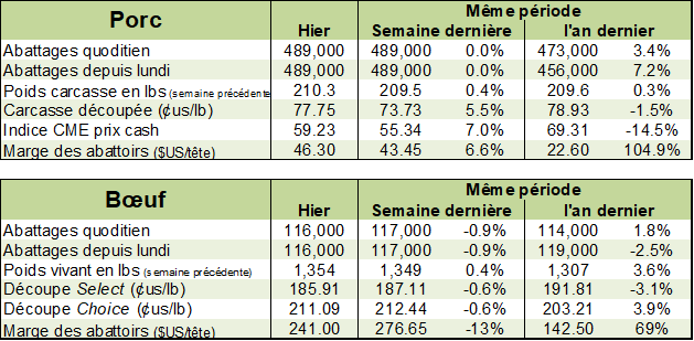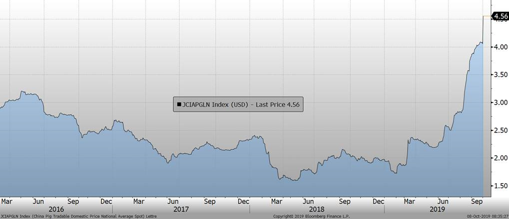 Après une semaine de congé, les chinois retournent au travail et mettre à jour les statistiques ce qui nous permet de voir ce qui s’est passé durant cette semaine. Le prix cash du porc a littéralement explosé de 12% depuis une semaine, en hausse de 50 $US/100kg. Le prix du porc est rendu à 456 $US/100kg en Chine, comparativement à +/- 200 $US/100kg en 2018 avant la crise de la PPA. De plus, on voit qu’il y a une forte demande pour la reconstruction du cheptel puisque le prix du porcelet s’est aussi envolé (+6%) et surpasse maintenant les sommets établis en 2016 à plus de 10 $US/kg. Bref, plus ça avance, moins on sait jusqu'où le prix peut monter… est-ce qu’on va connaître des prix à 600 $US/100kg dans quelques mois? Pendant ce temps, le prix cash avoisine les 200 $US/100kg carcasse en Espagne et Allemagne ce qui demeure plus élevé que les prix américains et brésiliens qui se situent plus autour de 130-140 $US/100kg. Peu importe où les chinois achètent, c’est une aubaine comparativement au prix local.