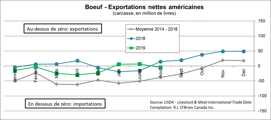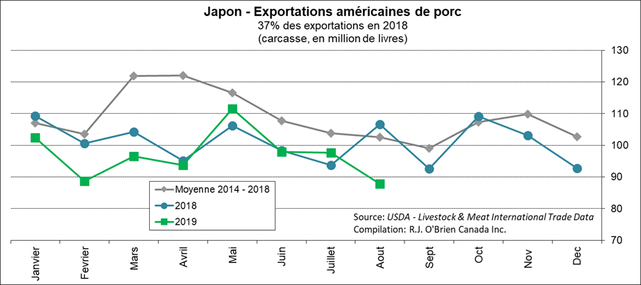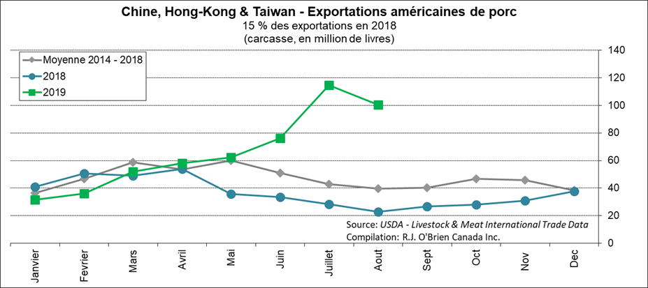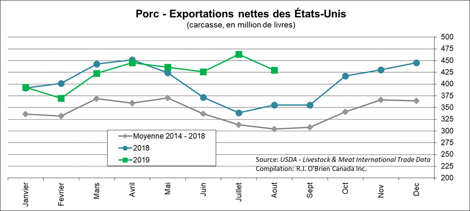 Hier, l’UDSA publiait les données d’exportation du mois d’août. Après de très bonnes ventes en juillet à 542M livres, les exportations américaines ont reculé en août à 508.5M livres principalement en raison des ventes vers la Japon qui ont reculé de 10 millions livres, des ventes au Mexique qui étaient 13.5 millions livres moindre ainsi que les livraisons en Chine qui ont reculé de 14 millions livres. Il faut dire que le prix du porc américain était très bas en juillet et ça l’avait possiblement stimulé les achats lesquels ont retourné à leur niveau habituel en août. Les importations américains étaient stables à 79 millions livres, dont 63% provenaient du Canada. Au final, les exportations nettes étaient de 430 millions livres, un recul de 33 millions livres comparativement au mois de juillet, mais 74 millions livres (+20%) de plus qu’en août 2018.