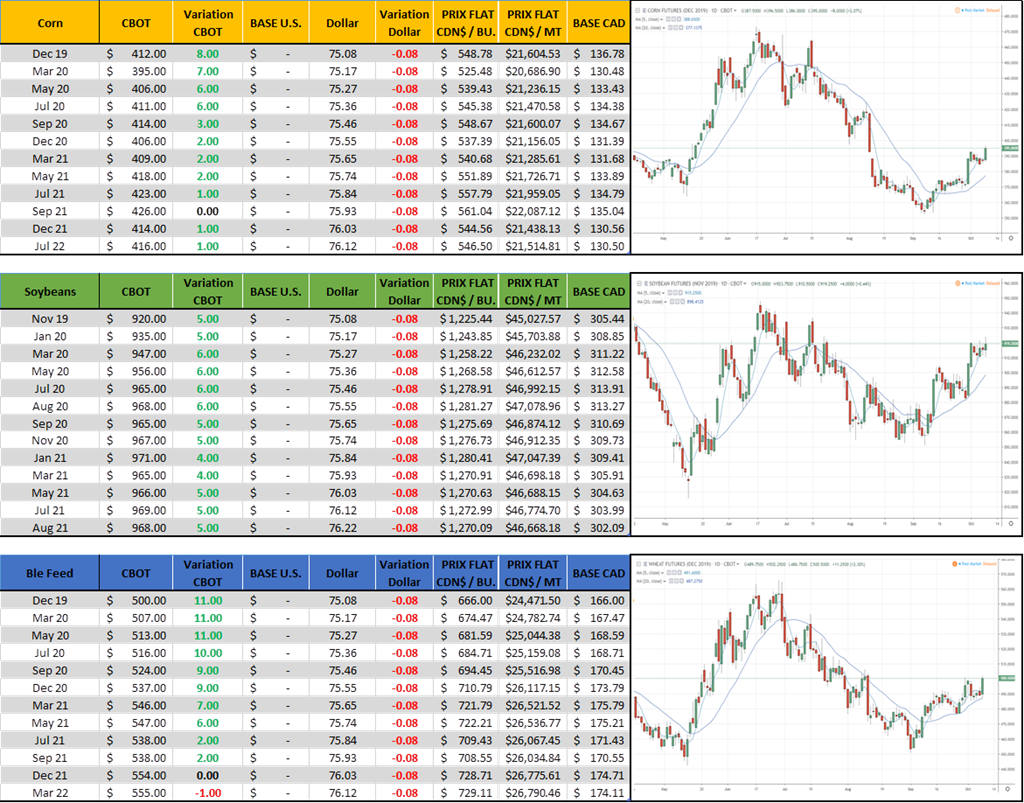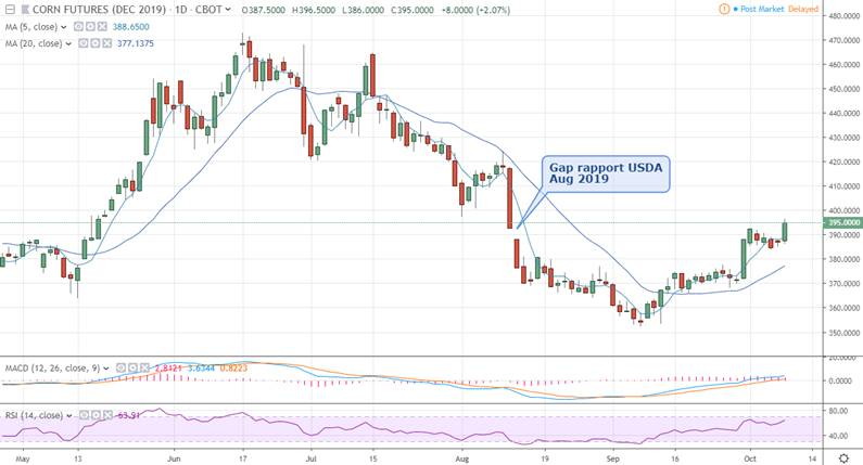 4 Analyse technique (graphe). Je note plusieurs chose sur le chart du maïs en ce moment. Premièrement aujourd’hui on est venu fermer le gap du mois d’aout, signe considéré comme positif en analyse technique. Depuis le début septembre ou les prix ont atteint 3.52 $bu, les moyennes mobiles se sont croisés à la hausse, même chose pour le MACD. Le RSI était survendu et le changement de direction du dernier mois valide l’indicateur. Donc oui, plusieurs point intéressants à noter sur ce graphique d’un point de vue technique. Est-ce que le rapport USDA de jeudi viendra additionner sur la lancée ou rabrouer les effort de reprise? À voir.
