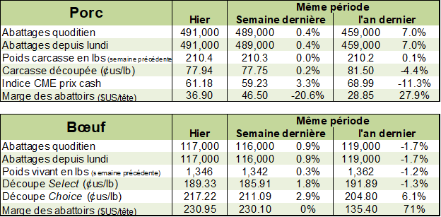 Alors qu’il manque de porcs en Chine, c’est totalement l’opposé aux États-Unis. La semaine dernière, les abattages ont atteint 2.725 millions têtes aux États-Unis, dépassant le record établit en décembre dernier. Les abattages étaient 9.1% supérieur à ceux de l’an dernier pour la même période… ça fait beaucoup de porc! Le poids continue d’augmenter en parallèle au température plus fraiche ce qui donne une production hebdomadaire de 573.3 millions lbs, en hausse de 9.2% versus l’an dernier.