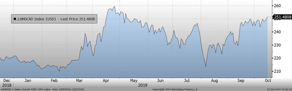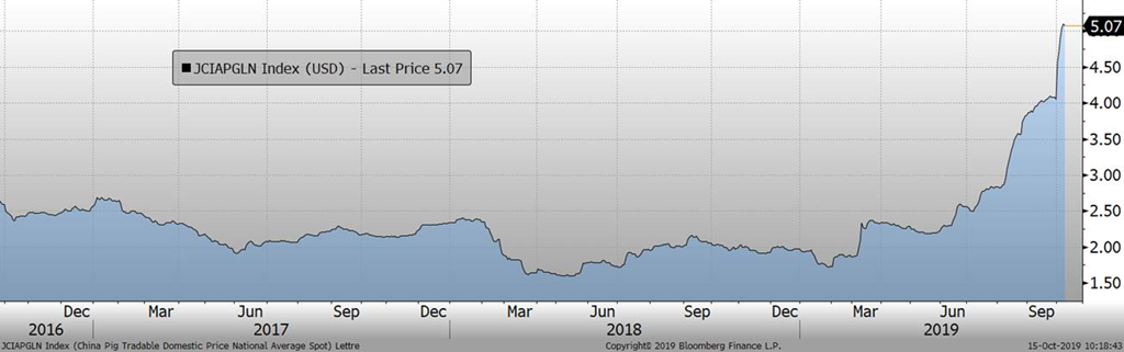 Le marché a commencé la journée sur un ton positif avec l’échéance de décembre qui gagne 2 cent/lb suite à quelques éléments positifs en Chine. D’une part, il y a eu de petits avancements dans la négociation de la guerre commerciale sino-américaine et finalement, Trump n’a pas augmenté le taux de taxation aujourd’hui, comme il s’apprêtait à faire avant la reprise des négociations. D’autre part, le prix en Chine continue de monter, présentement à 36 CNY/kg ce qui représente plus de 5.07 $US/kg… oui oui, 507 $US/100kg! Les statistiques d’inflation en Chine porte une mention particulière au prix du porc et la PPA, on voit donc que c’est un sujet très important en Chine. De plus, la ministère de l’agriculture en Chine rapporte une diminution de -41% du cheptel chinois comparativement au troupeau d’il y a 1 an, ce n’est donc pas surprenant de voir le prix exploser autant. Aussi, le nombre de truies est en baisse de -38.9% en septembre et on voit que le virus continue à prendre de l’expansion puisque le troupeau était en baisse de -38.7% en août et les truies en baisse de -37.4%. Selon les diverses discussions et analyses, on peut croire que la perte est au-delà des chiffres rapportés par le gouvernement chinois. Par exemple, Rabobank anticipe une baisse de -50% présentement et devrait aller jusqu’à -55% à la fin de l’année. Pendant ce temps, les grosses entreprises d’élevage prennent de l’expansion avec des investissements massifs pour reconstruire le cheptel en raison de la rentabilité actuelle en Chine.