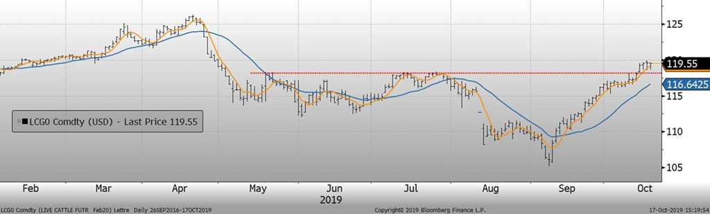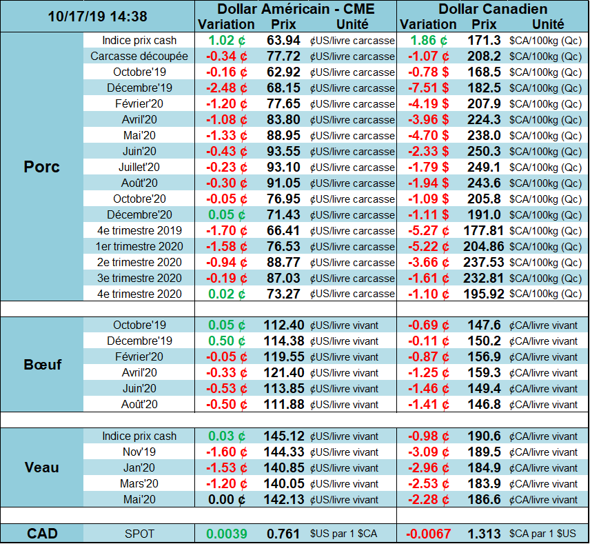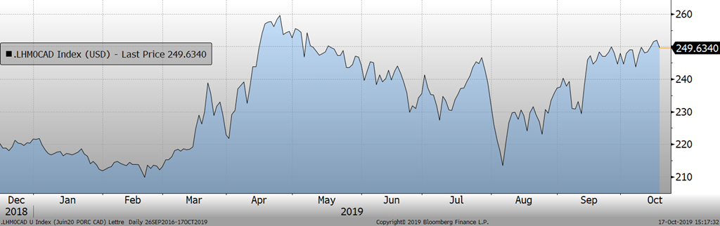 Le prix n’en finit plus de grimper sur les diverses échéances dans le bœuf. Les discussions au sujet des consommateurs américains qui puisent dans leur portefeuille pour finaliser des achats de viande de bœuf pour le temps des Fêtes ainsi que les analystes qui semblent convaincus de la possibilité d’exportations à la Chine qui sont grandissantes. Les prix sont à des sommets des 6 derniers mois. Un fait à noter; la production de viande de bœuf pour le dernier trimestre de 2019 sera en baisse par rapport au 3ieme trimestre, une première en 5 ans.