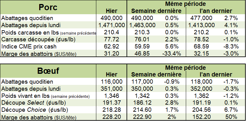 Le seul souci demeure l’abondance de viandes sur les marchés domestiques (porc et poulet) et aussi les craintes de récession économiques aux États-Unis. Une vigilance devrait être de rigueur pour les producteurs à ces niveaux de prix.