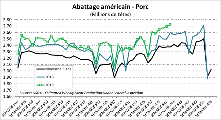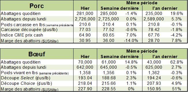 Pendant ce temps, le marché américain ne sort pas de sa situation d’abondance. La semaine dernière, les abattages ont fracassé un nouveau record à 2.73 millions porcs, en hausse de 4.9% versus l’an dernier. Le poids est similaire à l’an dernier, près de 211 lbs/carcasse. On se retrouve donc avec une production de 574 millions livres, on hausse de 4.8% versus l’an dernier.