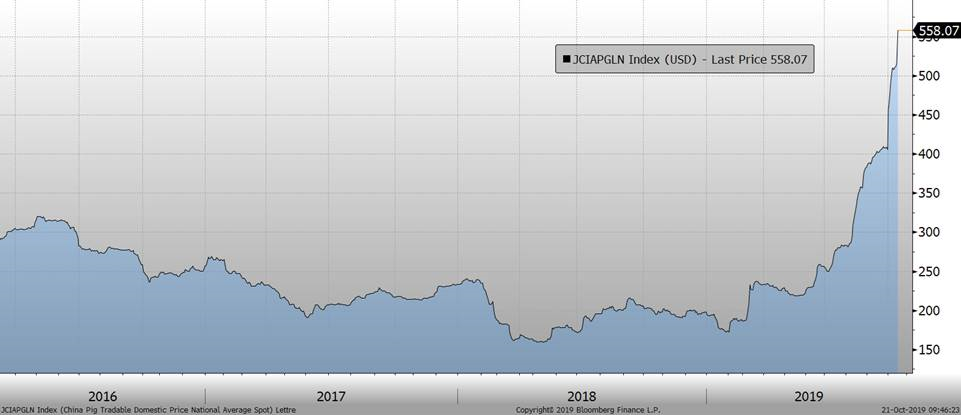 Le prix du porc à Chicago commence la semaine avec un petit gain de +1 c/lb, principalement grâce au prix chinois qui explose…et certainement pas à cause de la production américaine. Primo, le prix en Chine a grimpé de 8% ce weekend! Il est rendu à presque 40 CNY/kg, soit l’équivalent de 5.60 $US/kg. Secondo, l’USDA a publié son évaluation des dommages de la PPA au Vietnam et quantifie à 20% la perte du troupeau en plus d’avoir des doutes sur la stabilité de la maladie. On peut donc croire que le virus continue à se propager en Asie du Sud-Est. Face à la pénurie de viande en Asie, ce n’est pas surprenant de voir d’important joueurs tels que Tyson qui va retirer la ractopamine de sa production afin d’être conforme aux exigences chinoises.