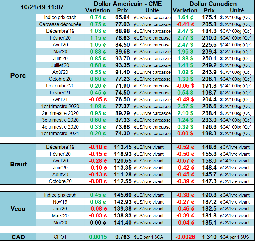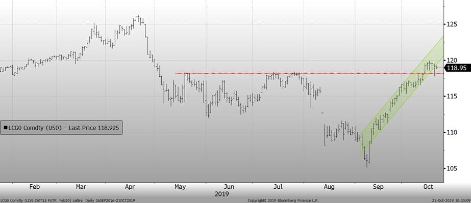 Le prix du bœuf a brisé la tendance baissière vendredi dernier en affichant une baisse de -1.9 cent sur octobre, mais seulement -0.75c et -0.48c sur décembre et février après avoir rebondit sur les supports techniques. Par exemple, l’ancienne résistance de 118c sur février a été défoncée avec un gap le 14 octobre. Cette ligne devient donc notre support technique et vendredi, le prix a effectivement rebondit sur ce support, preuve qu’il tient en place. Donc, en autant que les prix ne brise pas ces supports, c’est un marché qui reste plus intéressant à l’achat qu’à la vente. Une stratégie pour vendre pourrait être de mettre des ordres stop sous les supports technique.