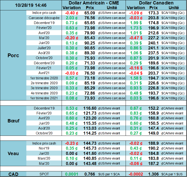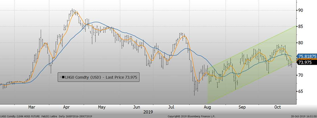 À noter que certains analystes américains deviennent de moins en moins optimiste pour les prix de 2020. Par exemple, Brock & Associates ont recommandé la semaine dernière de vendre 50% de la première moitié de l’année puisqu’il doute que l’impact des achats chinois ira largement au-delà de ce que la bourse offre présentement. Notre équipe a déjà développé sur le sujet ces 2 dernières semaines, mais de plus en plus, on voit le marché rebaisse en absence des achats chinois. Il faut garder en tête que les exportations vers la Chine représente 13% des exportations américaines cette année (versus 10% en 2018). Si la Chine double ses achats, les exportations américaines augmenteraient de 13% l’an prochain. Les exportations nette représentent environ 20% de la demande, ce qui ferait en sorte que le boom des achats chinois représente au net une augmentation de la demande de porc par +2.6%. En parallèle, la production américaine augmente de +2 à 4% par année… ce qui revient à dire que si la Chine double ses achats l’an prochain, ça viendrait à peine contrebalancer la croissance de la production américaine. Est-ce que cela justifiera des prix 10 à 15% plus élevés en 2020 que cette année? C’est ce qui vient dissiper l’optimisme des marchés présentement.