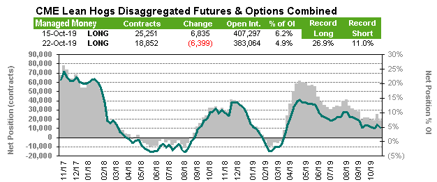 Même les spéculateurs deviennent moins motivés à garder des positions d’achat dans le porc. Seulement 5% des contrats à terme achetés sont détenus par des spéculateurs ce qui est relativement faible alors qu’on était à 20% en avril. Entre le 16 et 22 octobre, les spéculateurs ont liquidé 6,399 contrats pour une position nette de 18,852 contrats achetés.