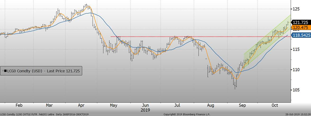 Le prix du bœuf a vraisemblablement pas envi d’arrêter de monter. Encore aujourd’hui, le prix des contrats affichait un nouveau sommet depuis le mois d’avril. Les prochaines résistances sont les sommets d’il y a 6 mois, à 126 c/lb sur février par exemple.