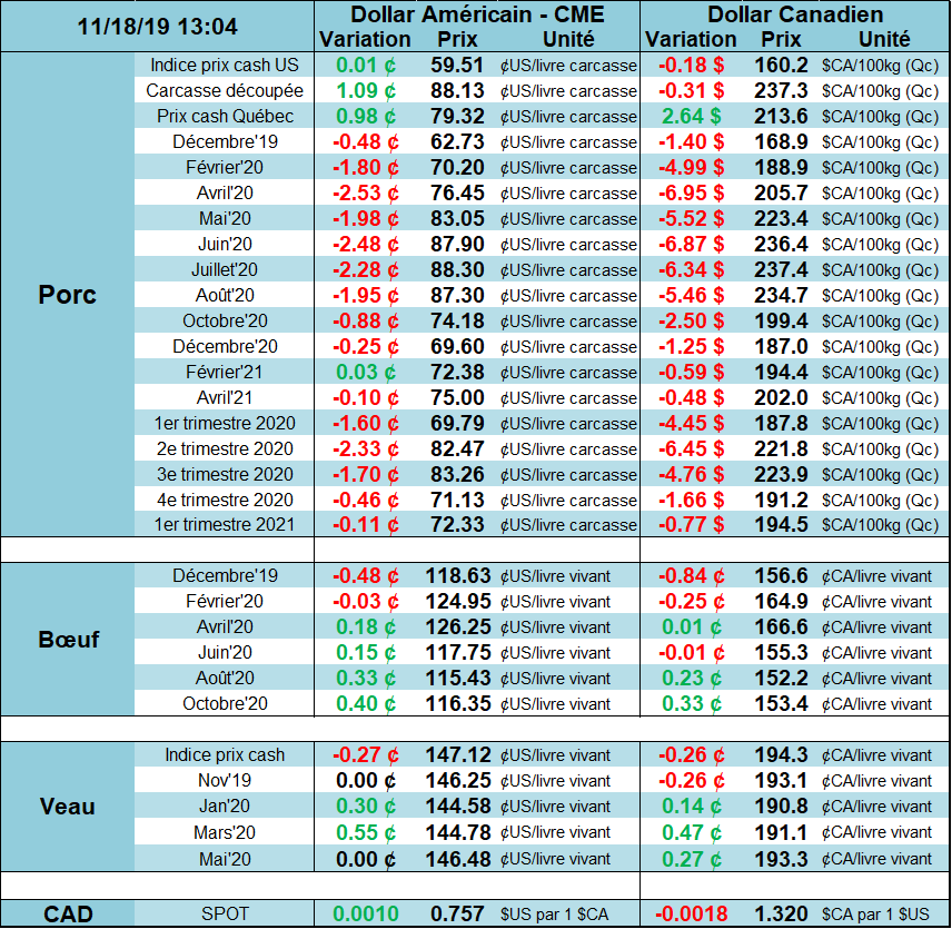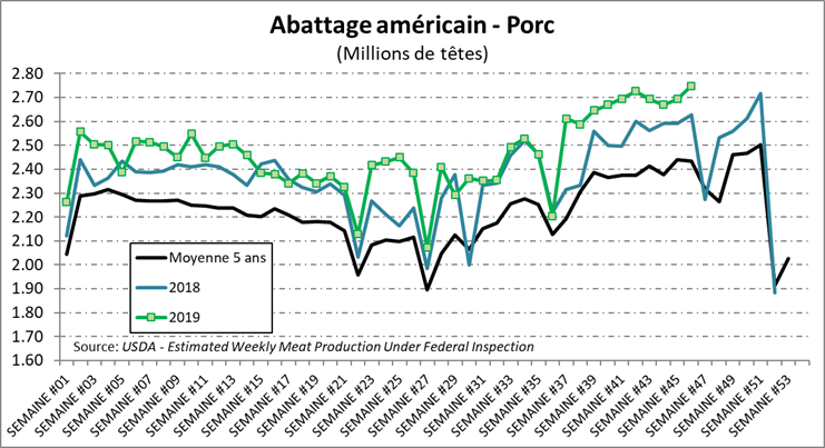 Cette situation de fièvre porcine en Chine a fait augmenter toute la courbe des contrats à terme à Chicago en 2019, mais on sent que le tapis est en train de glisser sous nos pieds. Depuis la semaine dernière, les contrats du CME ont perdu plus de 3% et ont commencé la semaine avec des pertes supplémentaires de 2.5%. Les producteurs américains flairant la bonne affaire ont produit une quantité importante de porcs pour le dernier trimestre de l’année. L’USDA a rapporté que l’industrie avait abattu 2 749 000 porcs la semaine dernière ce qui constitue un nouveau record (le dernier étant en décembre 2018). Malgré des poids de porcs vivants plus élevés, le poids moyen des carcasses présentait plutôt une très légère baisse par rapport à 2018. La production de viandes produite était en hausse de 4.6% par rapport à la même période en 2018.