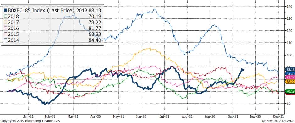 Le seul critère qui maintient encore les prix en alerte est la hausse du prix de la découpe qui a terminé la semaine à $88.13 USD /100 livres. Les prix du jambon et du bacon sont en forte hausse depuis 2 semaines maintenant et continuent de flirter avec les sommets des dernières années. Cette force indique vraisemblablement une bonne demande de la part des grossistes américains. Par conséquent, soit la demande des américains sera plus forte ou alors les exportations seront plus fortes (ou une combinaison des deux!). Aussi, cela gonfle la marge des abattoirs à des niveaux record, tout juste sous la barre du 90 $US/tête.