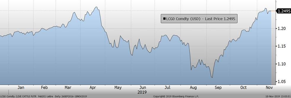 La demande demeure forte au niveau américain et exportations. Le manque d’offre mondiale de viande de bœuf fait en sorte que le production américain disponible ne le reste pas longtemps. De plus, le nombre de vaches envoyées à l’abattoir était en hausse de 5.5% la semaine dernière. Quand on regarde depuis le début de l’année, ces abattages sont en hausse de 3.0% par rapport à la même période en 2018. Diminue-t-on le cheptel reproducteur américain?