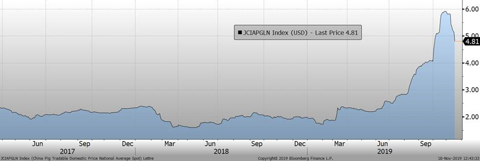 Un cours du weekend, le ministre de l’agriculture chinois M. Han Changfu a affirmé avoir ordonné à toutes les provinces productrices de porcs de multiplier les efforts afin de relancer la production porcine sur tout le territoire chinois. Beijing encourage les producteurs à augmenter la production de viande en général et pas seulement le porc, mais aussi la volaille. Par conséquent, tous les leviers financiers sont utilisés (prêts, subventions, grains pas chers). Le signal est donc sans équivoque. Il faut rappeler que plusieurs grands producteurs en Chine avaient débuté en septembre augmenté le nombre de truies. Incidemment, les prix du porc en Chine ont baissé rapidement depuis le 1 novembre dernier. Pour débuter la semaine, le prix a baissé de 5.8% ce qui fait suite à une baisse de plus de 12% la semaine dernière. Les prix anormalement élevés sont peut-être chose du passé en Chine. Évidemment, la situation demeure serrée alors que les statistiques montreront encore une fois une baisse du cheptel, mais la situation se redresse tranquillement. De plus, la Chine a annoncé dernièrement une reprise des importations de volaille américaine lesquelles sont pratiquement inexistantes depuis 2015. On voit donc que la Chine tente de compenser la perte de production porcine par des viandes substitues, rentrant en compétition avec le marché du porc.