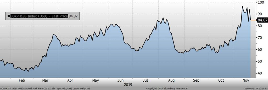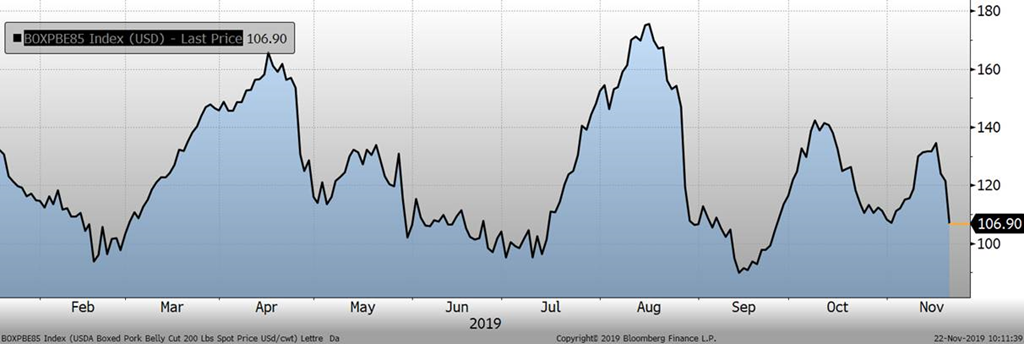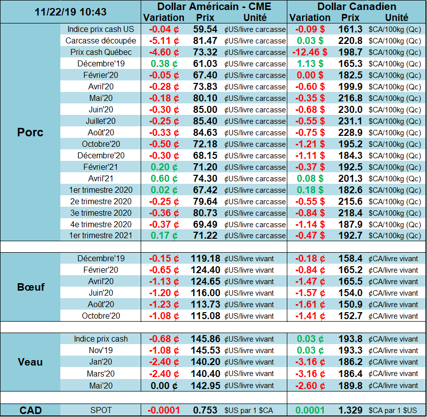 La baisse de la valeur des découpes est venu ternir le petit vent d’optimisme qu’on pouvait observé hier matin. Avant l’ouverture d’hier, l’USDA publiait les ventes à l’exportation qui étaient très bonnes, particulière grâce à la demande chinoise. Pour la semaine finissant le 14 novembre, il y a eu 54,400 tonnes vendues pour des livraisons en 2019 ainsi que 36,400 tonnes pour des livraisons 2020, pour un total de 90,800 porcs. Suite à cette publication, le prix avait commencé la journée d’hier à la hausse de 2 cents/lb, jusqu’à la publication du prix des découpes…
