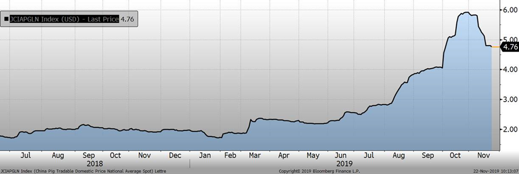 La Chine rapporte que son cheptel reproducteur a augmenté par +0.6% en octobre versus le mois précédent. C’est la première augmentation du cheptel à l’échelle nationale depuis avril 2018. De plus, sans de détail sur les chiffres, la Chine mentionne que la diminution du troupeau porcin ralentie. Pendant ce temps, la production de poulet à griller en octobre était en hausse de 16% versus 2018 ce qui devrait générer une augmentation de la production de volaille par 3 millions tonnes en 2019. Du côté des politiques sino-américaine, on navigue toujours dans l’incertitude. La phase 1 du futur accord commercial n’est toujours pas cédulé pour être signé en 2019 et on ne sait toujours pas si Trump augmentera les tarifs douaniers le 15 décembre. À cela s’ajoute le projet de loi qui a été voté mercredi quant à les droits de l’homme des hong-kongais et que Trump devrait éventuellement signer ce qui pourrait provoquer un réaction négative de la Chine.