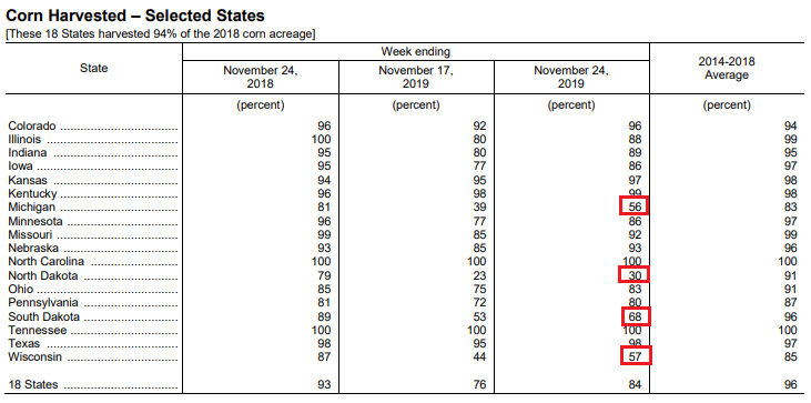 Selon l’USDA ces 4 états sont supposés récolter quasiment 12 millions d’acres de maïs, et à peine la moitié est sorti. Et on se questionne sur la suite. Peut-être qu’eux autre aussi les outardes vont être dodues.
