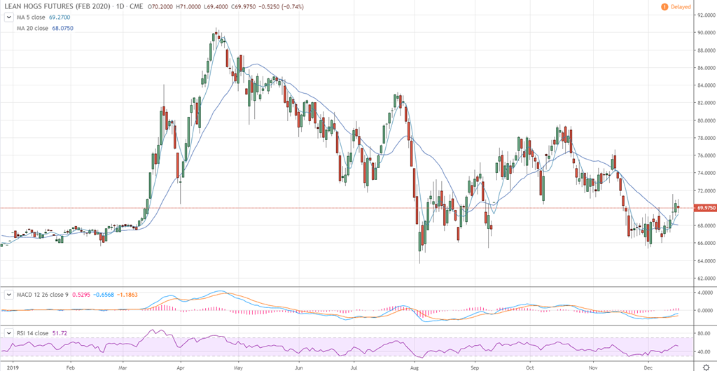 Le prix des contrats à terme de porc ont parti la journée en baisse suite à la publication du prix de la découpe hier en fin de journée. Le USDA a publié que le prix avait dégringolé de $2.32 USD / 100 livres pour s’établir à 79.56. La semaine débute encore avec une grande de porcs destinés à l’abattoir. L’industrie a accepté 492 000 porcs ce lundi. C’est 11 000 porcs de plus que 2018 pour cette journée. Le marché des contrats à terme demeure supporté par tout l’enthousiasme des possibles achats chinois. Les tarifs demeurent en place présentement et la Chine propose des exemptions à des entreprises importatrices afin d’importer de la viande de porc américaine. Les données d’exportations seront donc scrutées à tous les jeudis pour y voir si ces fameux importateurs sont actifs. Le marché américain aura cruellement besoin de ces exportations pour maintenir les prix au comptant le plus longtemps en territoire positif. Les producteurs américains sont véritablement en train de tester la capacité d’abattage de l’industrie depuis presque 3 semaines… en produisant des porcs qui n’étaient pas prévus par le USDA au départ (voir rapport Hog & Pig septembre)