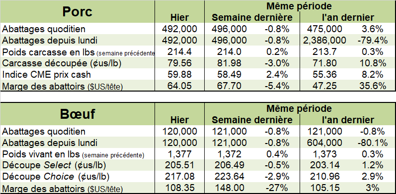 Malgré tous les appels répétés des spécialistes de l’industrie qui clamaient que les prix du bœuf étaient beaucoup trop élevés, les contrats à terme n’ont que faire de ces idées puisque ceux-ci sont constamment à la hausse. Il semble bien que les fonds d’investissement et les abattoirs y voient une opportunité d’acheter cher et de vendre encore plus cher! Les contrats à terme se transigent à des primes supérieures au prix au comptant et de façon importante par rapport à l’historique des écarts. Les prix au comptant transigent entre $117 et 120 au Nebraska alors que la moyenne des prix (5-area) se situe à $119.17. L’an dernier les prix se situaient autour de $118.14 USD / 100 livres. Le poids moyen est aussi 10 livres supérieur cette année. Encore une fois, les négociants essaient de rationaliser la demande potentielle chinoise en propulsant les prix à la hausse. Pourtant, malgré les espoirs portés par cette demande, la réalité demeure que les exportations américaines sont en baisse cette année dans ce produit spécifique (-4.2%) (contrairement au porc et poulet).
