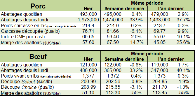 Les contrats à terme demeurent toujours sur le qui-vive malgré des fondamentaux de plus en plus fragiles. Le prix au comptant semble glisser vers le bas alors que les acheteurs pressent moins le pas et proposent des prix près de 117$ / 100 livres. Pourtant officiellement, les prix se négocieraient près de $119 / livre. Même le prix de la découpe a reculé depuis 1 semaine passant de $218.65 / 100 livres à $209.57 / 100 livres (-4%). Ce n’est pas un recul important, mais c’est la tendance qui importe. De plus, si le prix recule ainsi pendant encore quelques temps, la pression sera sur les éleveurs de livrer des animaux à des prix au comptant inférieurs. Les abattoirs voudront protéger leurs marges bénéficiaires. Le nombre d’animaux abattus est aussi en hausse par apport à 2018. Le USDA rapportait que l’industrie avait accepté 365 000 bêtes cette semaine comparativement à 345 000 l’an dernier. L’usine de Tyson ayant passée au feu en aout dernier est revenu opérationnelle et recoit quelques têtes. Il faudra quelques jours afin de mettre l’usine à niveau.