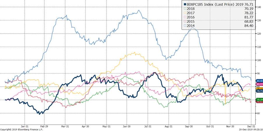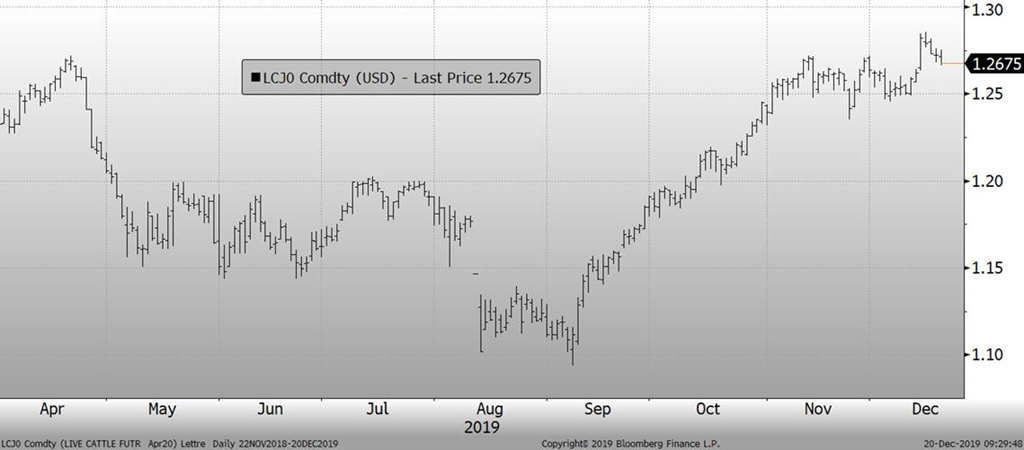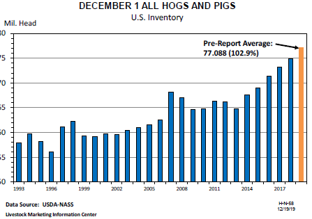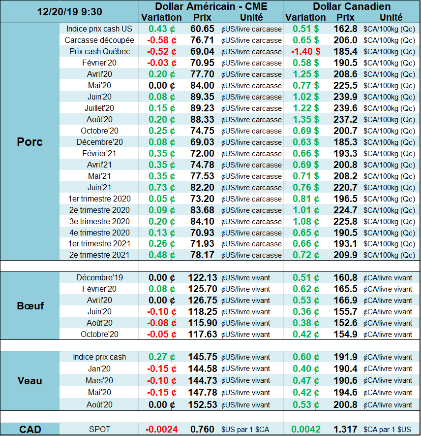 Le marché se prépare tranquillement à la publication de 2 rapports lundi 23 décembre : 1) Cold Storage et 2) le Hog & Pig. Selon les attentes des analystes, le USDA pourrait révéler un nombre records de porcs dans les bâtiments : 77.1 millions de porcs (+3%). Le nombre d’animaux reproducteurs serait en hausse de 1.6% selon les gens sondés. Évidemment, les vrais chiffres du USDA seront scrutés à la loupe lundi après la fermeture des marchés. Les prix du printemps reposent ainsi sur 2 choses : la discipline des producteurs américains à augmenter modestement et volontairement leur production pour le 1er trimestre 2020 et les ventes à l’exportation à venir. Pour l’instant, malgré de bonnes ventes, les producteurs ont tout simplement trop produit d’animaux ce qui empêche les prix de grimper à la Bourse ainsi que sur le marché cash.