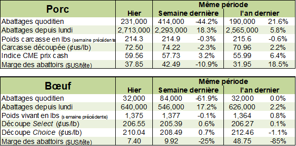 La semaine dernière, les abattage de bœuf étaient de 640,000 têtes, soit 1.4% de plus que l’an dernier. Le poids est supérieur à l’an dernier par +11 lbs/vivant à 1375 lbs et +10 lbs/carcasse à 827 lbs. Somme toute, la production hebdomadaire était de 528 millions lbs, en hausse de 2.7%.