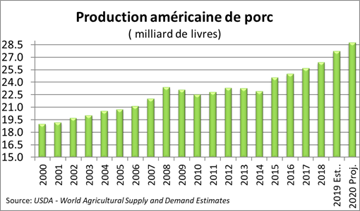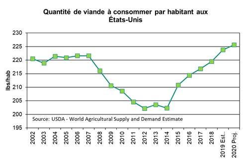 Pour l’année 2020, l’USDA prévoit une augmentation de 13% des exportations américaines, principalement grâce à la Chine. Le volume exporté devrait atteindre des records à 7.1 milliards de livres, une augmentation de 804 millions lbs versus 2019! Néanmoins, la production américaine de porc devrait s’établir à 28.7 milliards de lbs, un gain de 3.6% ou 1006 millions de lbs. Autrement dit, même après les exportations en Chine, il y aura plus de viande de porc aux États-Unis en 2020 qu’en 2019. Si on inclue les autres protéines animales (production : +3.6% poulet et +1.1% bœuf), l’abondance ne fait qu’augmenter. Relativement à la population, 2020 sera l’année pendant laquelle il y aura le plus de viande animale sur les tablettes d’épicerie, soit 225.6 lbs/habitant.