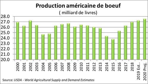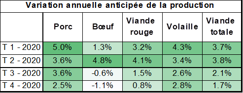 Vendredi dernier, l’USDA révisait ses prévisions lesquelles s’avèrent particulièrement négatives pour le prix de bœuf d’avril. Déjà qu’on s’attendait à une augmentation marquée de la production au 2èmetrimestre, l’USDA a rehaussé la production prévue à 7.14 milliards de lbs pour cette période, soit 4.8% de plus que l’an dernier. À l’exception de ce trimestre, l’offre de bœuf sera limitée ce qui devrait supporter les prix pour la deuxième moitié de l’année. Pour l’année 2020, l’augmentation de la production devrait se limiter à +1%, concentrée au T2, mais sera absorbée par la croissance des exportations à 3.3 milliards de lbs (+9.3%). Relativement à la population américaine, l’offre de viande bovine sera similaire à 2018 et 2019, avec 57.2 lbs/habitant.