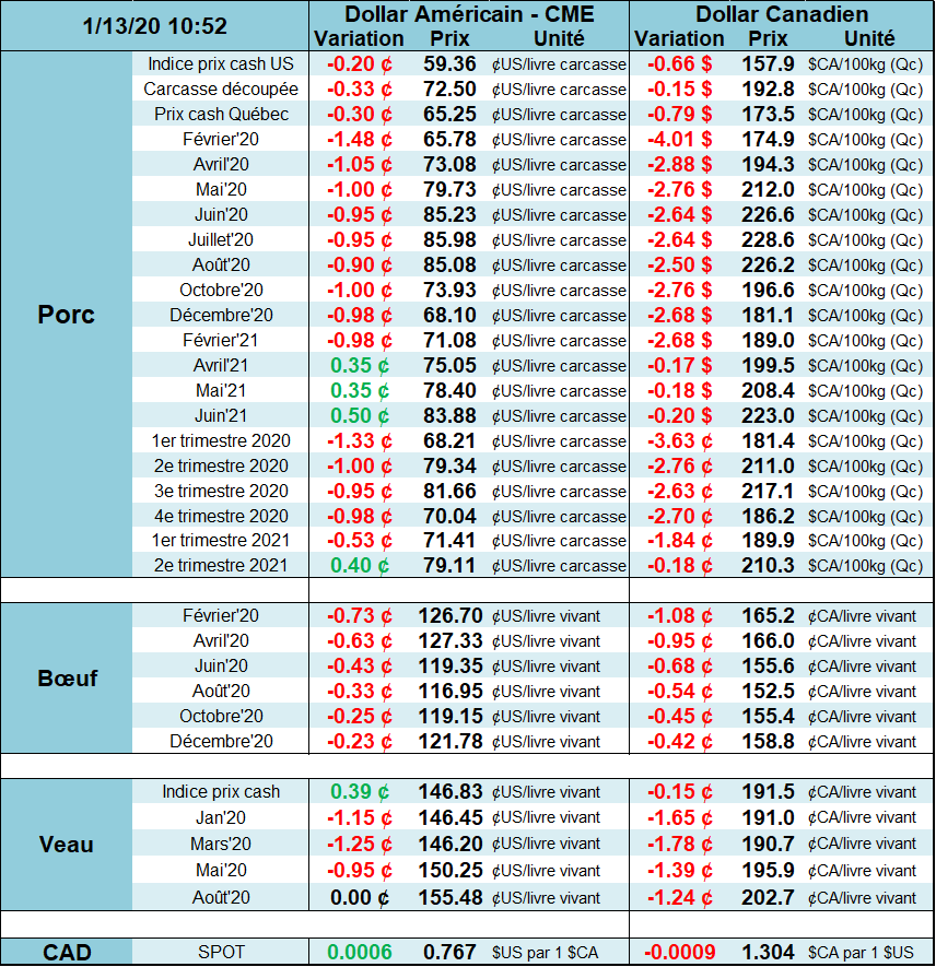 Le prix du porc commence la semaine à la baisse, notamment pour l’échéance de février qui chute de 1.5c à 65.70 c/lb (à 10h55). Définitivement, le marché est sur la déprime en raison de la piètre performance du marché cash. En plus de voir le prix cash incapable de surpasser la barre du 60c/lb depuis 2 mois, le prix des découpes de porc est aussi à la baisse à 72.50 c/lb vendredi, cumulant une baisse de -2.25c en 5 jours. C’est le plus bas niveau depuis 4 mois.