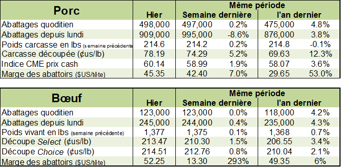 Maintenant qu’il y a moins de restrictions en Chine pour importer du bœuf américain, ça va possiblement prendre quelques temps avoir de voir un réel impact sur la demande extérieur. Le prix de bœuf gras d’avril se maintient à une prime de +3/+4 c/lb au-dessus du prix cash, lequel est stable à 124 c/lb depuis un moment.