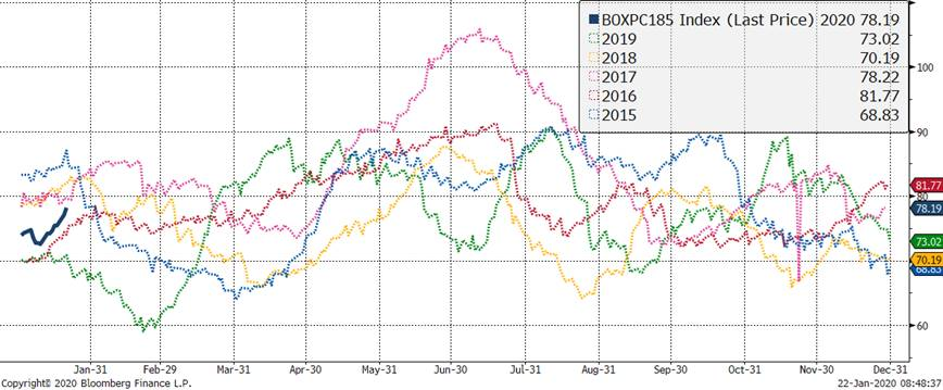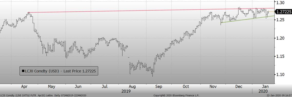 La Chine continue de liquider leur inventaire surgelé afin d’augmenter l’offre de viande en prévision d’une forte demande durant le nouvel an chinois. Pékin a annoncé la vente de 20,000 tonnes de porc congelé mardi ce qui un bel effort, mais représente des peanuts à l’échelle nationale. Mon interprétation sur la vente de porc surgelé du gouvernement chinois est que les congélateurs vont être vides à la fin du nouvel an chinois et qu’on pourrait voir les chinois augmenter la cadence d’importation pour rebâtir les réserves dans les prochaines semaines. Cependant, les taxes de représailles sont toujours en vigueur sur le porc américain, il reste donc à savoir quel sera l’impact de l’accord de phase 1 sur la demande de porc.