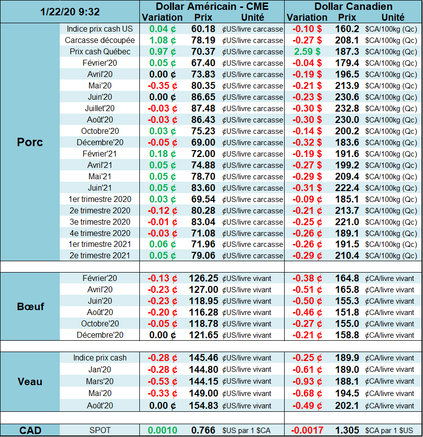 Hier à l’ouverture, le prix du porc a atteint son plus bas prix en 5 semaines à 72.32c/lb sur avril en raison du prix cash publié lundi, alors que les marchés étaient fermés en raison du jour de Martin Luther King. L’USDA annonçait lundi une baisse de -0.82c du prix cash alors qu’on progressait à la hausse les jours précédant. En fin de matinée hier, l’USDA publiait le prix cash en hausse de +0.98 c/lb, démontrant que la petit faiblesse de lundi était éphémère et que le prix cash continue sa remonté hivernale. En plus, le prix des coupes remontent rapidement, présentement à 78 c/lb, signe que la demande est forte pour le jambon dont le prix a bondit de 10% depuis 3 jours à 76 c/lb.