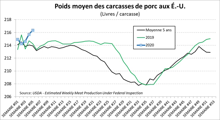 De plus, la production des dernières semaines est tellement abondante que le « timing » pour voir les exportations vers la Chine ralentir ne pouvait être pire. Pour la dernière semaine de janvier, les abattages étaient de 2.7 millions de porcs et ce, pour une 2ème semaine consécutive. C’est 14% de plus que l’an dernier. QUATORZE pourcent, c’est énorme!!! En plus, le poids s’accélère à des niveaux record à plus de 216 lbs/carcasse. On dirait bien que le retrait de la ractopamine chez certains gros intégrateurs américains n’a pas un effet négatif sur le poids. Si on combine des abattages records pour cette période de l’année avec un poids record, on obtient évidemment une très grosse production à 585 millions lbs, en hausse de 15.1% versus l’an dernier. Avec le refoulement des ventes en Chine, on se retrouve possiblement avec 17-% ou 18% plus de porc sur les tablettes d’épicerie cette semaine… et le Superbowl est passé ce qui aurait pu aider à écouler les ribs.