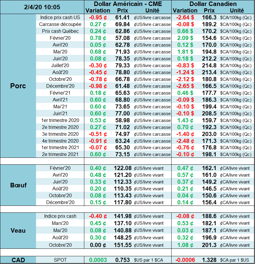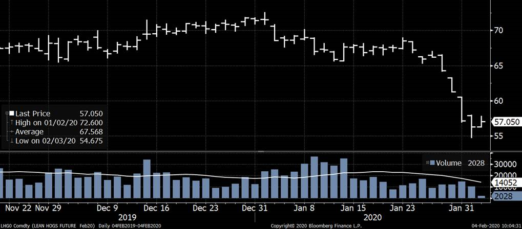 Le prix du porc a connu un petit rebond hier et ça se poursuit timidement ce matin, après une semaine mouvementée. La semaine dernière, le prix de février avait chuté de 10c/lb ou 15% de baisse. C’est assez rare qu’on voit un contrat qui est à moins de 2 semaines de son échéance varier autant, il faut qu’un changement soudain et majeur survienne pour que ça l’arrive… et ce fût le cas. Avec la propagation du coronavirus en Chine, les déplacements sont minimisés et cela affecte également les importations de viande de porc. En conséquence, la quantité de porc qui était destinée à la Chine se retrouve sur le marché local en attendant que le problème se règle. Aussi, il y a des rumeurs comme quoi la Chine évoquera un situation d’urgence majeure ce qui permettrait de ne pas respecter l’entente d’achat de marchandises américaines convenu dans l’accord de phase 1.