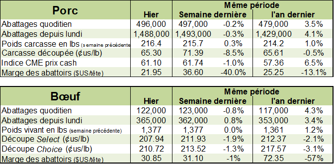 - La production porcine américaine continue d’être anormalement élevée. Le USDA rapporte des abattages quotidiens de plus de 495 000 porcs et les poids moyens des porcs abattus est supérieur de 2 livres par rapport au même niveau que l’an dernier.