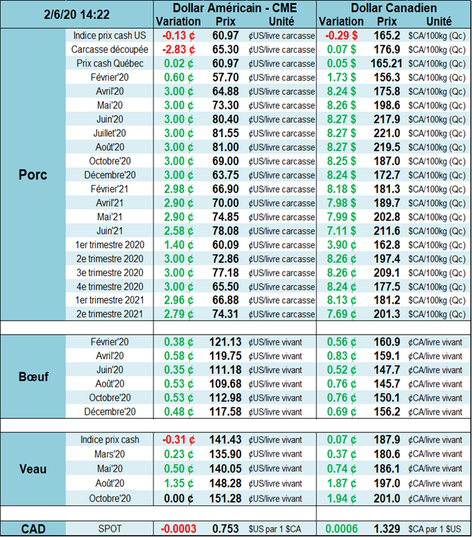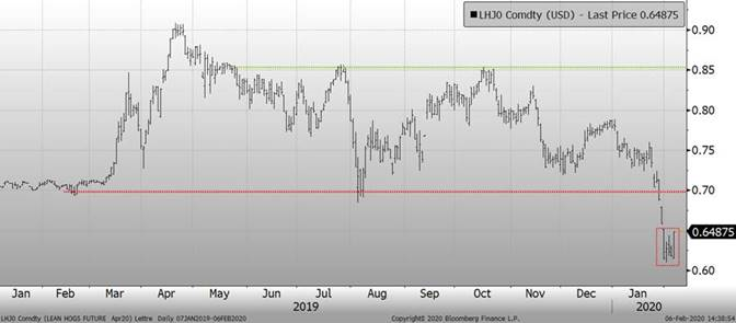 - La Chine vient d’annoncer (6 février) la diminution de 5% de tarif pour favoriser l’importation de porc américain. Cette mesure prendra effet le 14 février prochain. Le calcul est facile à faire ici, on abaisse les taxes de 5%, on augmente la valeur du prix US de 5%! Imaginez un instant si la Chine devait enlever toute les taxes! L’arbitrage devrait ainsi proposer une hausse des prix américains et une certaine baisse des prix mondiaux pour atteindre un nouvel équilibre. La même chose était arriver en 2018 avec le Mexique; les taxes mexicaines avaient réduit la valeur du porc américain.