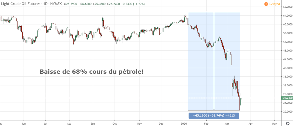 Sur la demande : comme si l’abondance n’était pas assez, la demande s’est effondrée elle aussi en l’espace de 48 heures. Le virus. Tout le monde à la maison. Pu d’avion dans le ciel. Pu de voitures sur les routes. Les usines en fermeture. Tout est au ralenti. Presque toutes les catégories d’utilisation tombent à zéro. Yikes! Tout d’un coup on nage dans l’abondance d’un produit que pu personne n’a besoin.