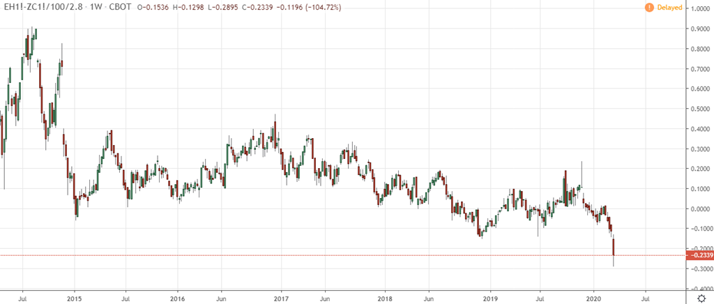Avec tout ça, le cours de l’éthanol a aussi planté. JAMAIS l’éthanol n’a été aussi cheap. Les transformateurs sont dans une situation extrêmement difficile. Aujourd’hui les marges de transformation sont dans le rouge SOLIDE. Acheter une tonne de mais pour le transformer en éthanol n’est vraiment pas rentable. Pas rentable pantoute. ET JE N’AI MEME PAS INCLU LES BASES qui rendent encore plus difficile la situation. Bobo.