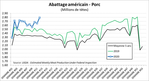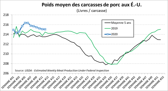 Pendant ce temps, on voit que la hausse du prix se résulte à des livraisons précipitées chez les éleveurs américains. La semaine dernière, les abattages étaient à 2.79 millions têtes (+11.5%), un record cette année et normalement, ce n’est pas en mars qu’on établit les records d’abattage. Samedi dernier, les abattages étaient de 313,000 têtes ce qui est très inhabituel pour cette période de l’année. Historiquement, c’est seulement arrivé à 10 reprises que les abattages du weekend surpassent le 300,000 têtes et c’est principalement au dernier trimestre. Aussi, ce qui nous indique que les livraisons sont un peu devancées présentement, c’est la baisse du poids moyen des carcasses laquelle a perdu 0.7 lb depuis un mois malgré la hausse des prix.