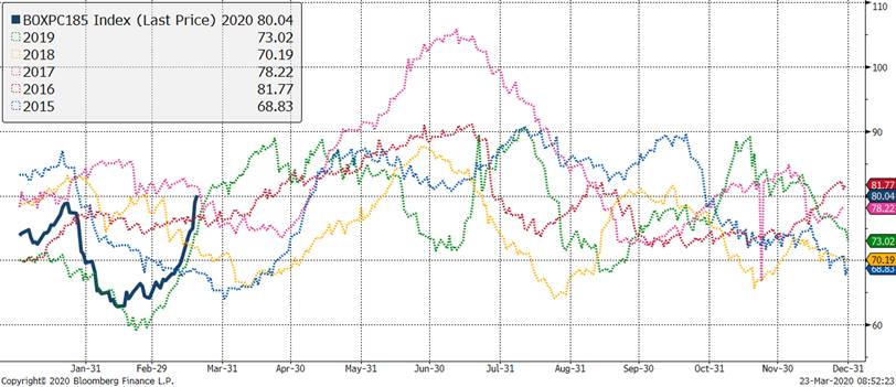 D’une part, la demande au détail est extrêmement forte puisque la panique fait en sorte que tout le monde se comporte comme des écureuils en novembre… on fait des réserves! Ça fonctionne bien pour les cannes de pois, mais un peu moins pour la viande qui est périssable. Est-ce qu’on verra une baisse de la demande locale bientôt puisque les frigos sont pleins? Présentement, il n’y a aucune signe de ralentissement. Le prix des découpes de porc s’envole, atteignant vendredi la barre du 80 c/lb pour la première fois en 2020. En conséquence, la marge des abattoirs a grimpé à presque 40 $US/tête ce qui incite l’industrie de la transformation à travailler en temps supplémentaires. Étrangement, quand on regarde la courbe du prix des découpes (ligne bleue), c’est pratiquement la même tendance que l’an dernier (ligne verte).