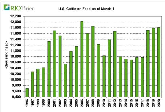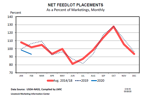 Malgré les tempêtes dans le monde économique, financier et familial, l’USDA continue de publier certains rapports dont le Cattle on Feed mensuel. Pour plusieurs le rapport fut sans surprise alors que l’organisme a publié des chiffres près de attentes du marché. Si on résume cela : 1) les placements de veaux en février se ont établis à 92.1% (att : 92.4%), 2) les mise en marché pour février sont à 105.5% (att : 105.6%), et 3) le nombre d’animaux dans les parcs sont à 100.2% (att : 100.3%). Les chiffres sont toujours par rapport au niveau des animaux dans la même situation l’an dernier. Ainsi pas de surprise, mais la tendance montre tout de même un peu moins d’animaux disponibles pour le futur. Il sera intéressant de voir comment se comporter les prix vers la fin de l’année 2020.