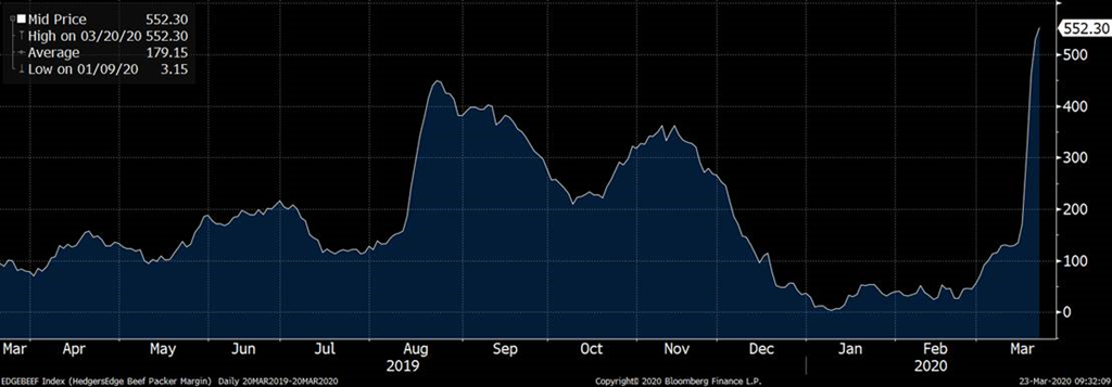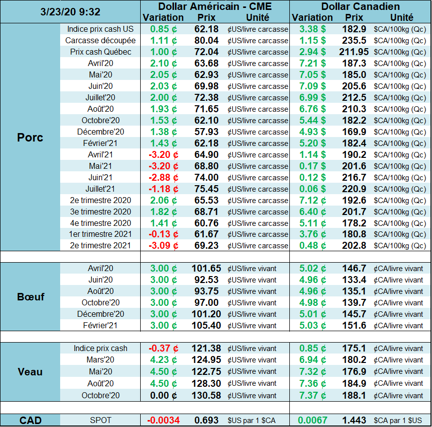 Bien que le marché avait commencé la crise du COVID-19 en panique pour le prix des viandes, de plus en plus, on commence à réaliser que cette crise pourrait être favorable pour le prix, du moins à court terme (qui se risquerait de faire des prévisions à long terme en moment!?).