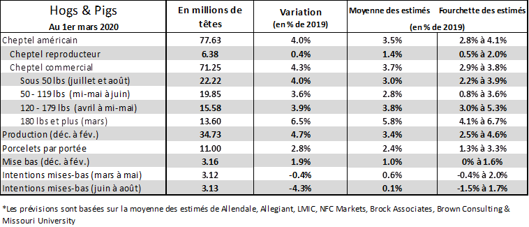 Brièvement, le rapport de l’USDA sur le cheptel américain au 1er mars est plutôt négatif pour les prix boursiers puisqu’il y a plus de porcs qu’anticipés, notamment pour les porcelets et les porcs de 50 à 119 lbs.