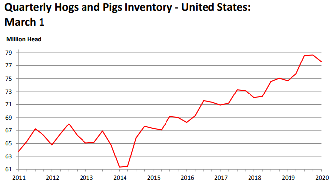 Retournons au rapport trimestriel Hogs & Pigs. Premièrement, l’USDA a révisé à la hausse le cheptel des 2 derniers trimestres par plus d’un million de porcs… et oui, ils viennent de trouver un million de porcs! Possiblement bien caché dans le fonds de l’Iowa. À cela vient s’ajouter une production de 34.7 millions de porcelets (+4.7%), soit 1.3% de plus que les estimés. Au final, le nombre de porc que les américains élèvent pour la commercialisation était de 71.25 M au 1er mars, en hausse de 4.3% et surpassant la fourchette des estimés.
