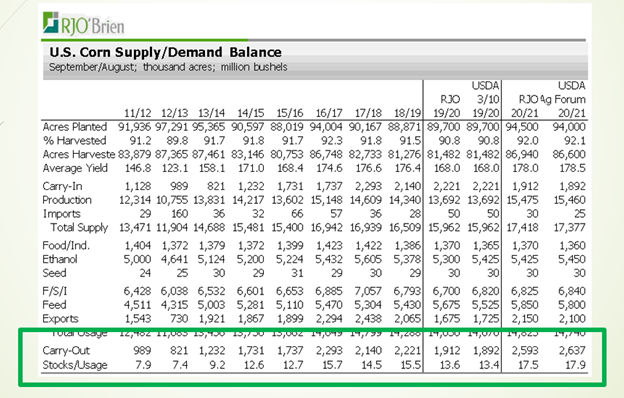 Et quand je plug ca dans un tableau offre demande. Ca fait une ABONDANCE de mais àl’automne. Actuellement aux States on évalue les inventaires de fin à 1.9 milliard. Avec 94 millions d’acres et un rendement « normal » et une demande « normale » on arrive SUR PAPIER à 2.5-2.6 milliard d’inventaire. C’Est du stock en siouplait! Et la demande qui est so-so en ce moment ça porte les ratios d’utilisation à 17% et plus… et suggère donc un équilibre de prix assez faible. La situation peut changer, je ne connais pas l’avenir et la météo et le rendement de cet été, mais SUR PAPIER c’est difficile d’être MEGA bullish.
