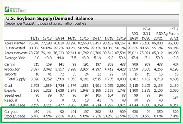 Le bilan du soja est clairement plus friendly, même si les acrages bondissent de presque 10 millions d’acres cette année. En utilisant la meme logique de situation « normale » en termes de rendement et de consommation, les inventaires de fin seraient entre 300-400 millions et cela est loin de l’abondance ridicule de 2018 à plus d’un milliard de boisseaux.