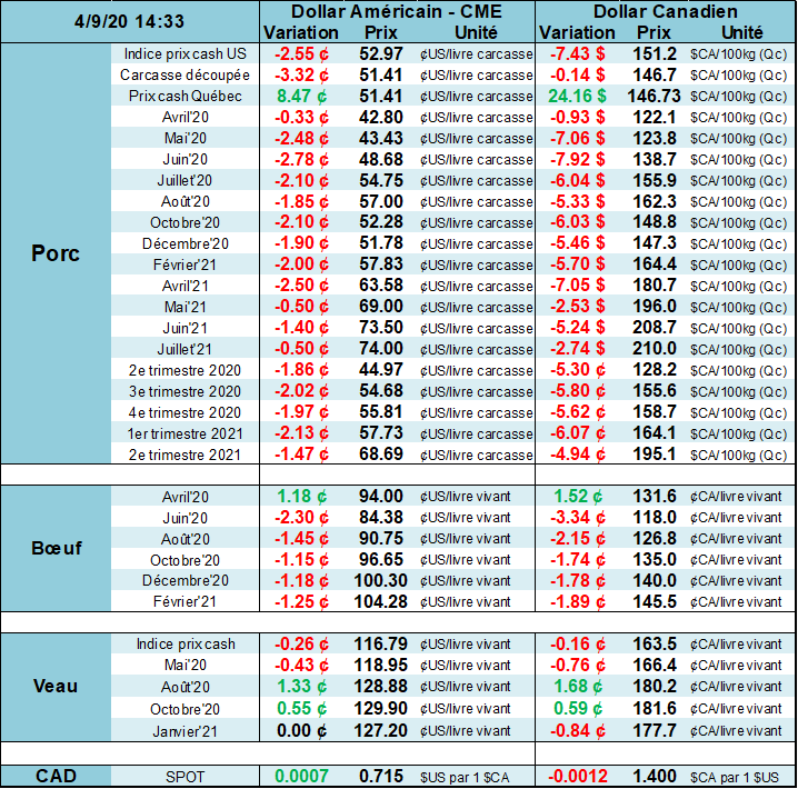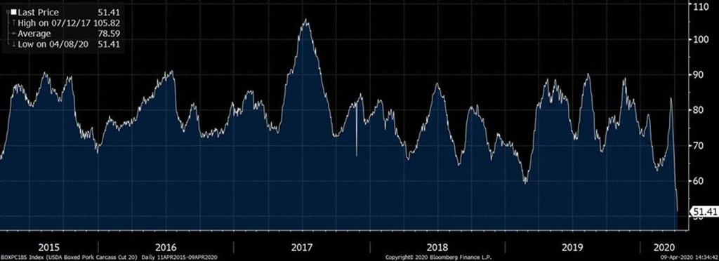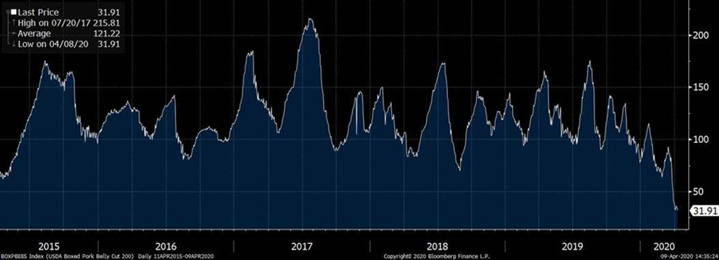 - Les abattoirs ont aussi un problème ces temps-ci au niveau de la logistique et la demande des produits découpés. Après le rush de la demande d’il y a 2 semaines, les consommateurs ont refroidi leur ardeur au niveau des achats alors que le portefeuille se dégarnit rapidement et que l’aide des autorités fédérales tardent à arriver dans leur compte de banque. Les restaurants demeurent fermés, les écoles aussi et ceci fait en sorte que la demande demeure faible pour certains produits. Par exemple, le bacon vient d’atteindre 30 cents US/ livre! Les restos-déjeuner ne sont pas là pour supporter la demande habituelle. De plus, on lit qu’il est plus difficile d’offrir le produit dans de plus petites boites (portions) pour les consommateurs au supermarché. Habituellement, les ventes destinés aux gros consommateurs se font dans des formats plus gros. Par conséquent, le bacon s’accumule, le jambon aussi. En espérant que le printemps sera hâtif pour que le tout le monde ouvre leur barbecue et cuisine des ribs et autres produits carnés. Le prix de la découpe se situe à une creux des 17 dernières années présentement.