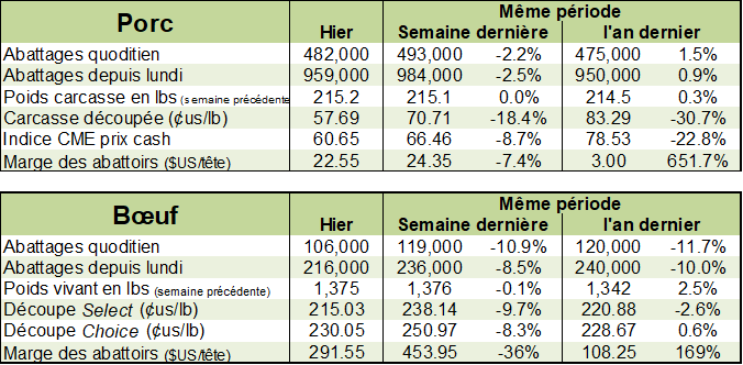 Donc encore une fois une situation complexe, mais par contre, après des mois difficiles (marges négatives depuis 6 mois), les producteurs américains pourraient en avoir assez et finalement réduire leur production prévue pour les prochains mois. Encore une fois le nombre de truies destinées à l’abattage continue d’être presque 8% de plus que l’an dernier. Mais qu’en est-il des nouvelles cochettes disponibles? De plus, avec la récession économique à venir, le crédit sera plus difficile et les spécialistes anticipent de grandes faillites. L’industrie agricole est solide, mais n’est pas immunisée contre une crise de liquidité. Il est possible que des projets d’expansion soient mis sur pause indéfiniment.