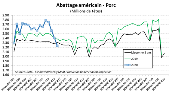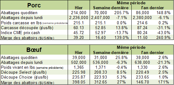 Ceci dit, on voit bien que les opérations d’abattage roulent au ralenti, partout en Amérique du nord. Aux États-Unis, les abattages de porc ont baissé de -7% par rapport la semaine précédente, à 2.23 millions têtes. Dans le bœuf, c’est similaire avec une baisse des abattages par -6.3%. Inévitablement, avec moins de viande qui sort des abattoirs, l’effet sur le prix des découpes commence à se faire sentir. Le prix des découpes de porc a terminé la semaine à 60.13 cents, en hausse de 8c/lb en 2 jours. Pour le bœuf Select, c’est 13c/lb qui le prix des découpe s’est apprécié la semaine dernière.