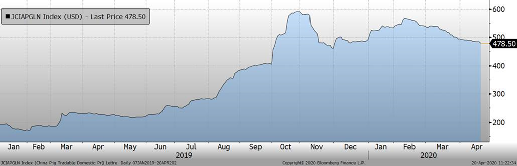 Le ministère chinois de l'Agriculture, lors d'une conférence vidéo sur les perspectives pour 2020, a déclaré que le troupeau de porcs abattus en 2020 devrait diminuer de près de 8% par rapport à l'année dernière à 501.5 millions de têtes, tandis que la consommation de porc devrait diminuer de 5.6% en 2020 à 42.1 millions de tonnes métriques (MTM). En conséquence, les importations de porc augmenteraient de près de 33% à 2.8 millions tonnes. La production de porc en 2020 est estimée à 39.3 MTM et devrait atteindre 54 MTM d'ici 2022. L'USDA estime que la production de porc chinoise de l'an dernier était de 42.6 et la consommation à 44.9 MTM, les deux baissant en 2020 à 34.0 et 37.8 MTM, respectivement. L'USDA indique que la consommation de porc chinois en 2018 est de 54.0 millions tonnes. En résumé, la Chine ne se sortira pas de la PPA avant encore 2 ans et l’année 2020 sera encore plus dur qu’en 2019.