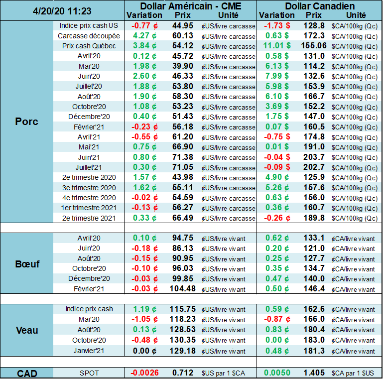 Qui aurait cru voir le pétrole transiger à 10$/baril, en baisse de 40% aujourd’hui? Et pourtant, c’est ce qui se passe ce matin pour l’échéance de mai, l’équivalent du prix au comptant, puisque les inventaires sont à pleine capacité et on ne sait plus où mettre la nouvelle production. Je vous parle du pétrole pour la simple raison que ça démontre bien comment la crise du COVID peut venir chambouler une chaine de production entière. Puisque les américains continuent de pomper du pétrole comme jamais pendant que les routes sont désertes, la pandémie cause un scénario qui n’avait été envisagé par personne… et on peut faire ce parallèle avec le marché des viandes aussi. Vous êtes tous au courant de l’enjeux au niveau de l’abattage, mais on réalise qu’il n’y a pas juste l’industrie des viandes qui est impacté. Il y a des limites sur certaine variable dans une chaine de production (i.e. capacité d’abattage, capacité d’entreposage, capacité d’exporter, etc.) et la pandémie vient tester ces scénarios!
